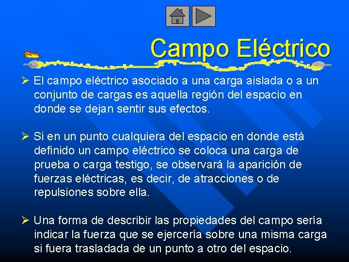 Campo Eléctrico Ø El campo eléctrico asociado a una carga aislada o a un conjunto de cargas es aquella región del espacio en donde se dejan sentir sus efectos. Ø Si en un punto cualquiera del espacio en donde está definido un campo eléctrico se coloca una carga de prueba o carga testigo, se observará la aparición de fuerzas eléctricas, es decir, de atracciones o de repulsiones sobre ella. Ø Una forma de describir las propiedades del campo sería indicar la fuerza que se ejercería sobre una misma carga si fuera trasladada de un punto a otro del espacio.