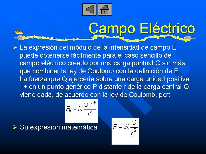 Campo Eléctrico Ø La expresión del módulo de la intensidad de campo E puede obtenerse fácilmente para el caso sencillo del campo eléctrico creado por una carga puntual Q sin más que combinar la ley de Coulomb con la definición de E. La fuerza que Q ejercería sobre una carga unidad positiva 1+ en un punto genérico P distante r de la carga central Q viene dada, de acuerdo con la ley de Coulomb, por: Ø Su expresión matemática:
