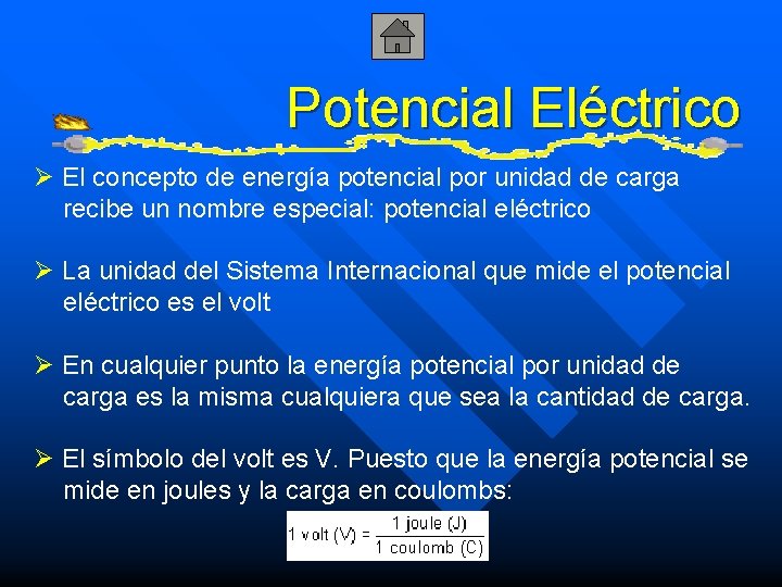 Potencial Eléctrico Ø El concepto de energía potencial por unidad de carga recibe un nombre especial: potencial eléctrico Ø La unidad del Sistema Internacional que mide el potencial eléctrico es el volt Ø En cualquier punto la energía potencial por unidad de carga es la misma cualquiera que sea la cantidad de carga. Ø El símbolo del volt es V. Puesto que la energía potencial se mide en joules y la carga en coulombs: