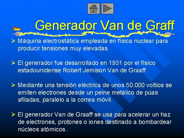 Generador Van de Graff Ø Máquina electrostática empleada en física nuclear para producir tensiones muy elevadas. Ø El generador fue desarrollado en 1931 por el físico estadounidense Robert Jemison Van de Graaff. Ø Mediante una tensión eléctrica de unos 50. 000 voltios se emiten electrones desde un peine metálico de púas afiladas, paralelo a la correa móvil. Ø El generador Van de Graaff se usa para acelerar un haz de electrones, protones o iones destinado a bombardear núcleos atómicos.