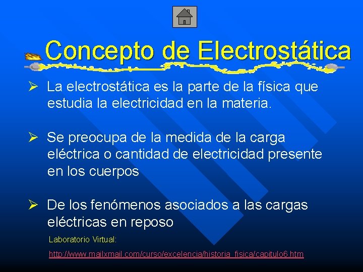Concepto de Electrostática Ø La electrostática es la parte de la física que estudia la electricidad en la materia. Ø Se preocupa de la medida de la carga eléctrica o cantidad de electricidad presente en los cuerpos Ø De los fenómenos asociados a las cargas eléctricas en reposo Laboratorio Virtual: http: //www. mailxmail. com/curso/excelencia/historia_fisica/capitulo 6. htm