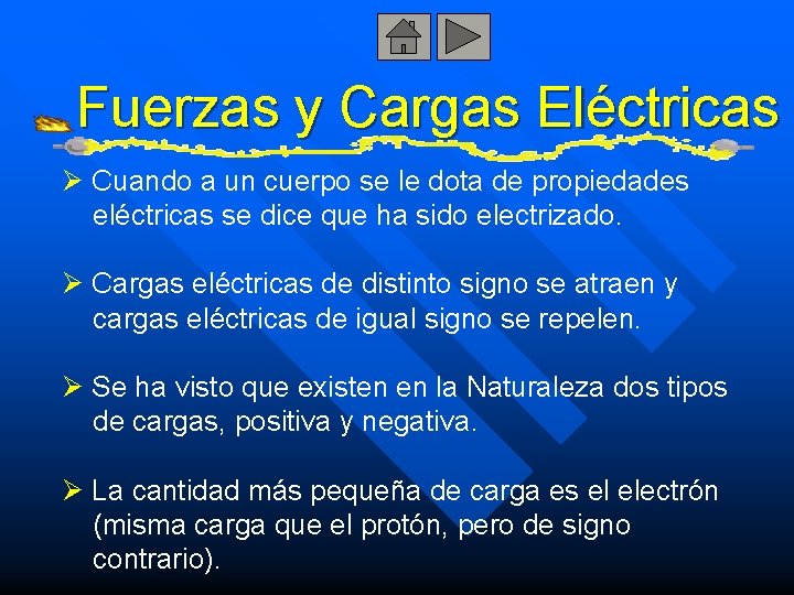 Fuerzas y Cargas Eléctricas Ø Cuando a un cuerpo se le dota de propiedades eléctricas se dice que ha sido electrizado. Ø Cargas eléctricas de distinto signo se atraen y cargas eléctricas de igual signo se repelen. Ø Se ha visto que existen en la Naturaleza dos tipos de cargas, positiva y negativa. Ø La cantidad más pequeña de carga es el electrón (misma carga que el protón, pero de signo contrario).