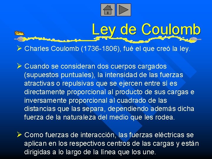 Ley de Coulomb Ø Charles Coulomb (1736 -1806), fué el que creó la ley. Ø Cuando se consideran dos cuerpos cargados (supuestos puntuales), la intensidad de las fuerzas atractivas o repulsivas que se ejercen entre sí es directamente proporcional al producto de sus cargas e inversamente proporcional al cuadrado de las distancias que las separa, dependiendo además dicha fuerza de la naturaleza del medio que les rodea. Ø Como fuerzas de interacción, las fuerzas eléctricas se aplican en los respectivos centros de las cargas y están dirigidas a lo largo de la línea que los une.