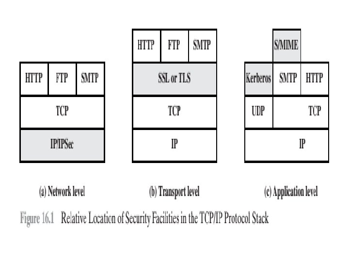 Web Traffic Security Approaches • Application-specific security services are embedded within the particular application. Figure 16. 1 c shows examples of this architecture. • The advantage of this approach is that the service can be tailored to the specific needs of a given application.