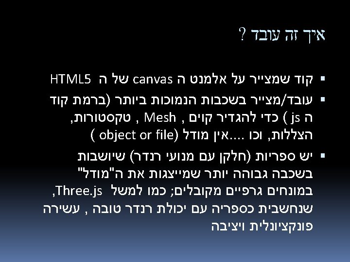 Web. GL איך בונים משחק ב : דוגמא Choosing a framework (three. js ? ? ? ) Drawing graphics Loading (3 D) models Building a particle systems Animation Integration…. . Integration 2 D+3 D Adding Sound Making it Robust Putting it all together http: //www. slideshare. net/auradeluxe/webgl-forgame-development-2012