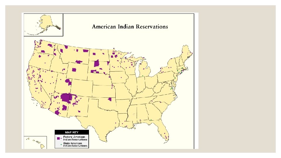 Indian Reorganization Act- 1934 ◦ The act curtailed the future allotment of tribal communal lands to individuals and provided for the return of surplus lands to the tribes rather than to homesteaders. It also encouraged written constitutions and charters giving Indians the power to manage their internal affairs. Finally, funds were authorized for the establishment of a revolving credit program for tribal land purchases, for educational assistance, and for aiding tribal organization. ◦ With the funds for purchase of land, millions of additional acres were added to the reservations. Greatly improved staffs and services were provided in health and education, with more than half of all Indian children in public school by 1950.