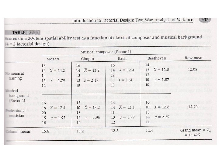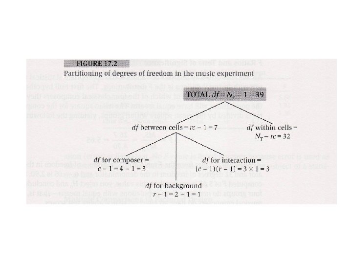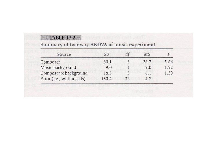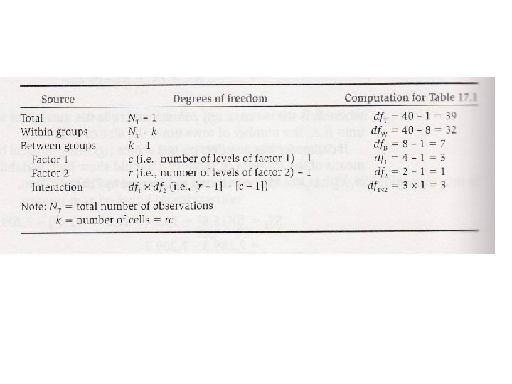 1. A B. C. D. E. F. Compute SST Compute SSB Subtract SSB from SST to obtain SSW (error) Compute SS 1 Compute SS 2 Compute SS 1 x 2 by subtracting SS 1 and SS 2 from SSB 2. Convert SS to MS by dividing SS by the appropriate d. f. 3. Test MS 1, MS 2 and MS 1 x 2 using F ratio.