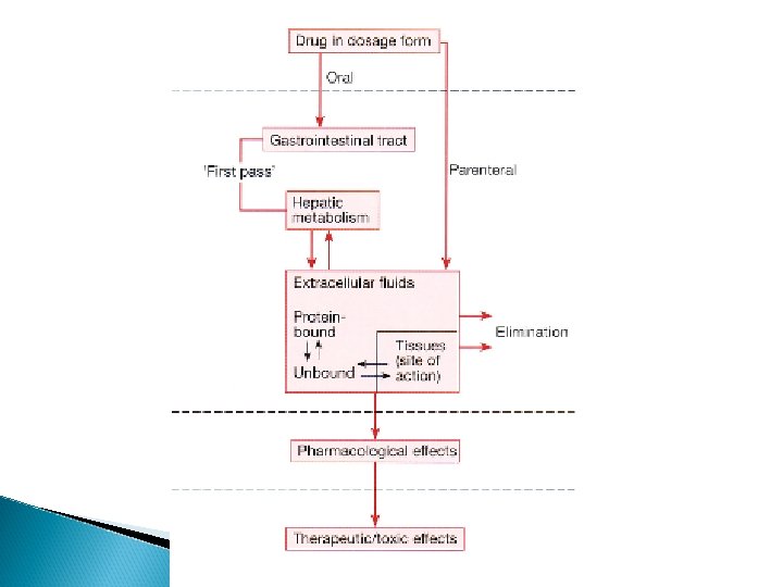 First-pass metabolism � First pass metabolism - term used for the hepatic metabolism of a drug when it is absorbed from the gut and delivered to the liver via the portal circulation. � The greater the first-pass effect, the less the agent will reach the systemic circulation when the agent is administered orally