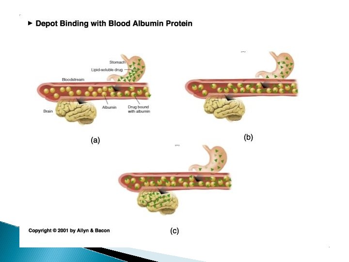 Absorption and Distribution � Mostly a passive process - ◦ from higher conc to lower (in blood) � Binding to plasma proteins ◦ results in a store of bound drug in plasma �examples - � 95 -99% - chlorpromazine, diazepam, imipramine � 90 - 95% - valproate, propanolol, phenytoin