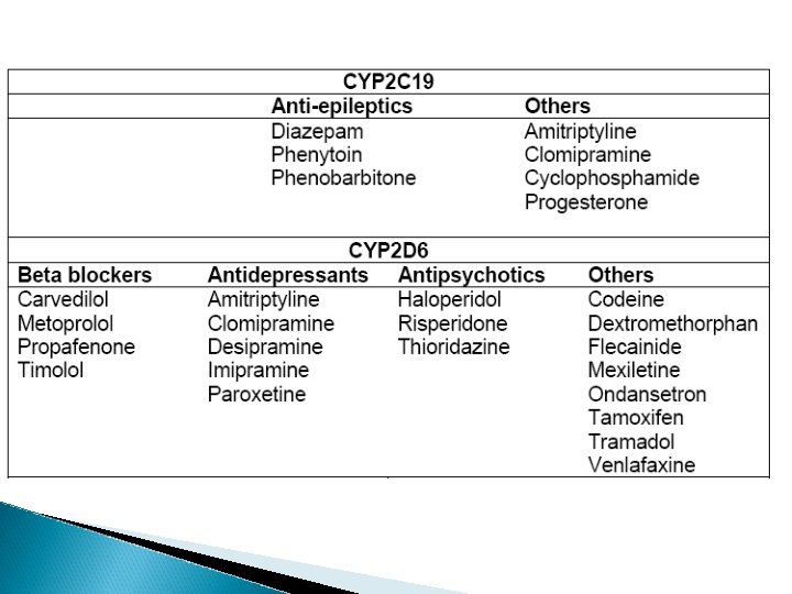 Cytochrome p 450 enzyme family � located primarily in hepatocytes � important for metabolism of alcohol, tranquilizers, barbiturates, antianxiety drugs, estrogens, androgens, PCBs and other agents � oxidative metabolism – makes drugs more water soluble (so more easily excreted) � There about 12 CYP families. ◦ CYP 1, 2, and 3 = most common for drug metabolism. ◦ CYP 2 D 6 and CYP 3 A (especially 3 A 4) metabolize over 50 percent of drugs.