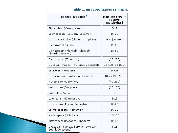 � lorazepam (Ativan) and triazolam (Halcion) – pharmacokinetics � lorazepam – persists for at least 24 hr � triazolam – 6 – 8 hours � midazolam – 1 – 2 hrs