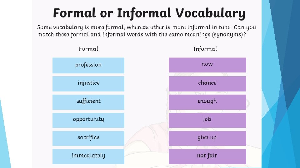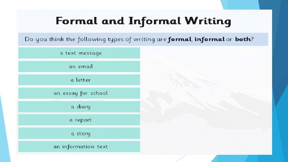 Informal Speech and Writing So, what is informal speech or writing? When or where would you use it? An informal style is more commonly used where we are more familiar with our audience and have a less important purpose for writing or talking. Informal writing tends to have a chatty, conversational style that may talk directly to the reader. It often includes: • slang/dialect (words like awesome) • contracted words (like don’t and shouldn’t) • question tags – this is a contraction at the end of a statement that turns it into a question. Here is an example: The weather is great, isn’t it?
