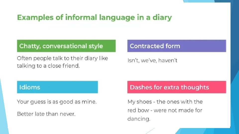 Week 2 Year 5 – English - Diary entries This week in Year 5, we are learning how to write diary entries. A diary entry is a form of recount in which the writer explains (or recounts) what has happened to them. As part of this, we will be focusing on features of informal writing which means writing in a chatty, relaxed style. Depending on the situation, we adjust our formality which means we change the way we write or speak. If we were speaking to the queen, we would talk in a much more formal way than we would if we were speaking to a friend on the playground or writing something (like a diary) that only we would read. In this week’s activities, you will read some diary entries and complete some reading practice and look at the features of diary entries. You will also learn about informal writing and by the end of the week, you will write your very own diary entry.