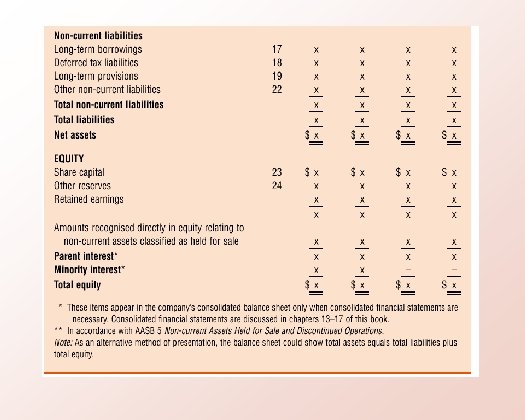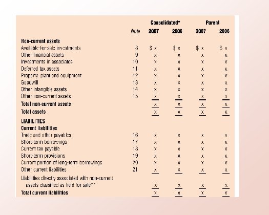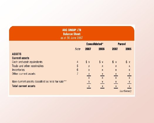 XYZ GROUP LTD Balance Sheet as at 30 June 20 X 4 Consolidated NOTE ASSETS Parent 20 X 5 20 X 4 $ $ Current Assets Cash and cash equivalents X x X Trade receivables X x X Investments X x X Inventories X x X Other current assets X x Total Current Assets X 0 x 0 X 0 0 Non Current Assets Available for sale investments X x x X x Other financial assets X x x X x Investments in associates X x x X x Deferred tax assets X x x X x Property, plant and equipment X x X X X Goodwill X x X X X Other intangible assets X x X X X Other non-current assets X x X X X Total Non Current Assets Total Assets 0 0 $0 $0