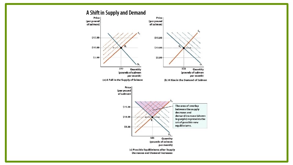 Shifts in Supply and Demand: Example • By itself, decrease in supply leads to – Higher equilibrium price. – Lower equilibrium quantity. • By itself, increase in demand leads to – Higher equilibrium price. – Higher equilibrium quantity. • Combined effects? – Higher equilibrium price – Equilibrium quantity?
