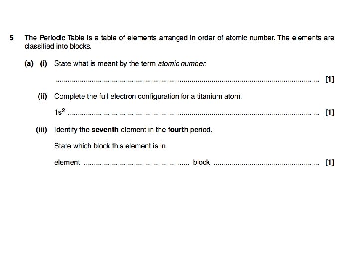 Week 5 • Describe the relative energies of s-, p- and d-orbitals for the shells 1, 2, 3 and of the 4 s- and 4 p-orbitals. • Deduce the electron configuration of atoms and ions up to Z = 36. • Classify the elements into s-, p- and d-blocks. © Pearson Education Ltd 2008 This document may have been altered from the original