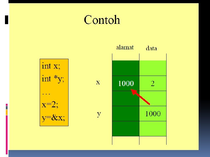 Apa itu Pointer? ? Pointer adalah sebuah variabel yang digunakan untuk menyimpan alamat memori dari variabel lainnya. Berguna untuk pengalokasian memori secara dinamis