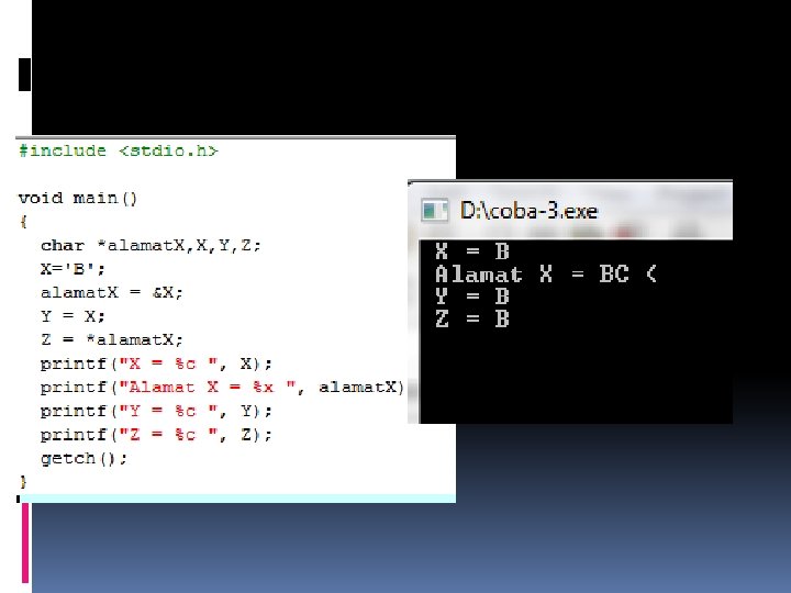 // my first pointer Contoh #include <stdio. h> void main(){ int firstvalue, secondvalue; int * mypointer; mypointer = &firstvalue; *mypointer = 10; mypointer = &secondvalue; *mypointer = 20; printf("firstvalue is %d ", firstvalue ); printf("secondvalue is %d ", secondvalue ); getch(); }