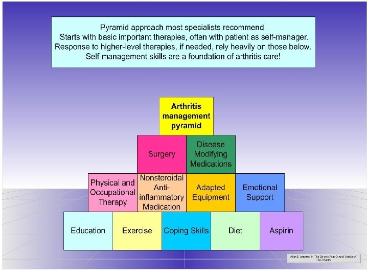 Self-Management Example This next slide uses a person with Rheumatoid Arthritis Keep in mind, higher-level treatments tend to be less effective if there are problems at lower levels