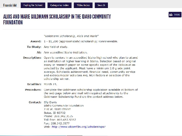 Idaho State Board of Education https: //boardofed. idaho. gov/scholarship Opportunity Scholarship � Have an unweighted, cumulative GPA of 2. 7 � Attending an Idaho college. � Complete the FAFSA Governor's cup - Community Service Idaho Postsecondary Credit Scholarship ‣ Have at least 10 postsecondary credits and a matching business or industry merit based scholarship