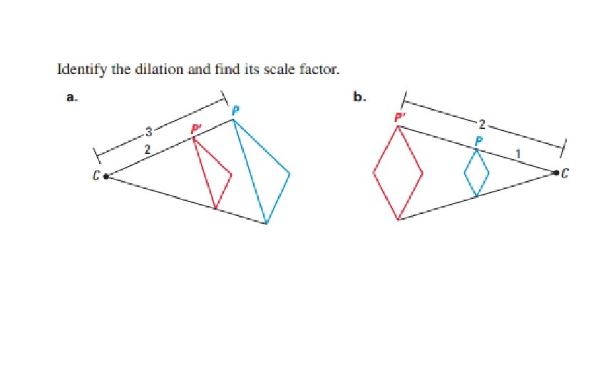 Requirements For Dilation with center C and scale factor K maps point P to P’, and… 1. If P is not on C, then P’ is on 2. If P is on C, then P=P’ CP. Also Scale factor k = CP (k>0 and k≠ 1 ) P’ P C C P = P’