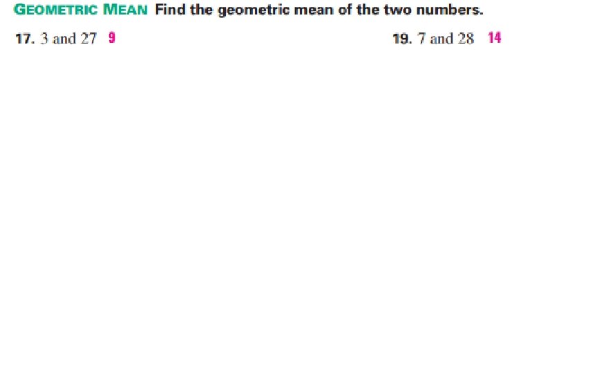 Geometric Mean Given two numbers ‘a’ & ‘d’ the geometric mean is the value ‘x’ such that… a x = x d and x = a∙b