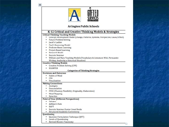 Virginia Gifted Regulations – APS Local Plan 2017 - 2021 Virginia Department of Education regulations state that each school district must develop a plan to identify and provide services to those students who have learning needs beyond the regular instructional program. https: //www. apsva. us/wpcontent/uploads/2015/04/2017 -2022 -Gifted. Services-Local-Plan. pdf