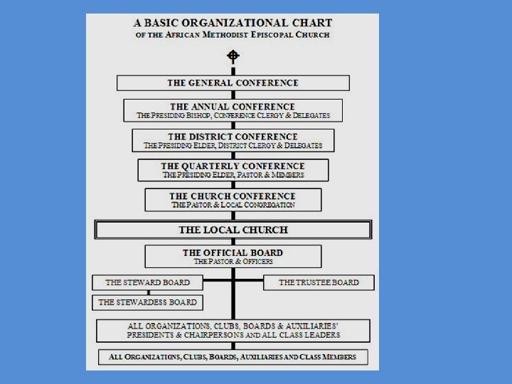 A. M. E. Church Emblem The word African means that the church was organized by people of African descent and heritage. It does not mean that the church was for persons of African descent only. The church's roots are of the family of Methodist churches. Methodism provides an orderly system of rules and regulations and places emphasis on a plain and simple gospel, helping the poor, evangelistic preaching, devotion, and personal bible study. Episcopal refers to the form of government under which the church operates. The chief executive and administrative officers of the African Methodist Episcopal Church are the Bishops of the church. Church refers to the "Christian Church, " which is a community of people who believe in God and who have accepted Jesus Christ as Savior and Master of our lives which is symbolize by the Cross.