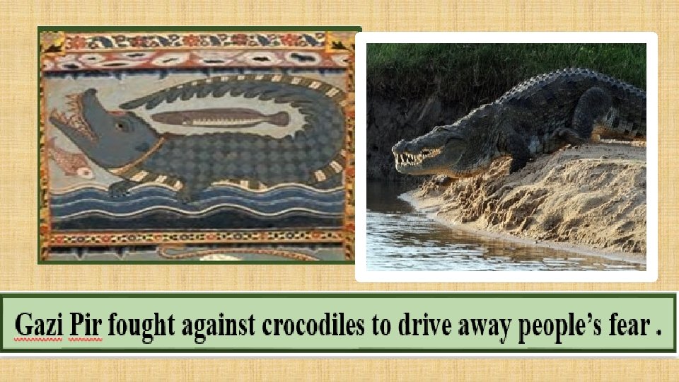 Silent Reading The Legend of Gazi According to some myths and legends , Gazi Pir was a Muslim saint who is said to have spread Islam in the parts of Bengal Close to the Sunderbans. He was credited with many miracles. For examples, he could supposedly calm dangerous animals and make them docile. He is usually depicted in paats or scroll paintings riding a fierce –looking Bengal tiger, a snake in his hand, but in no apparent danger.