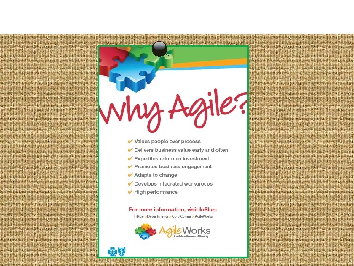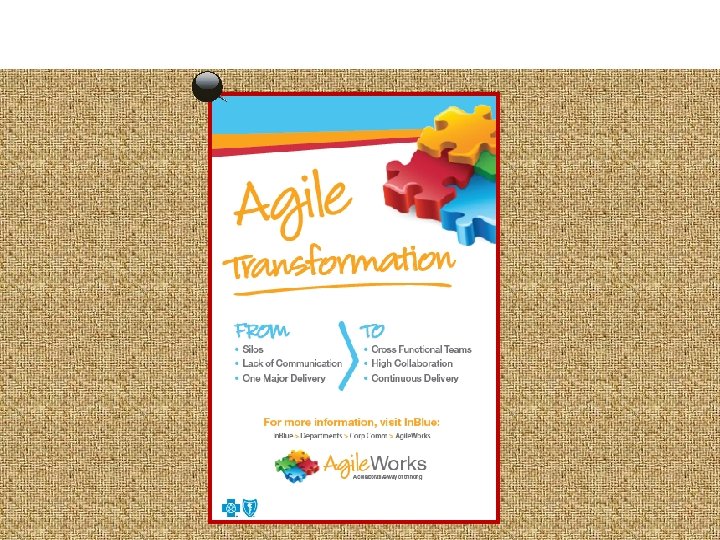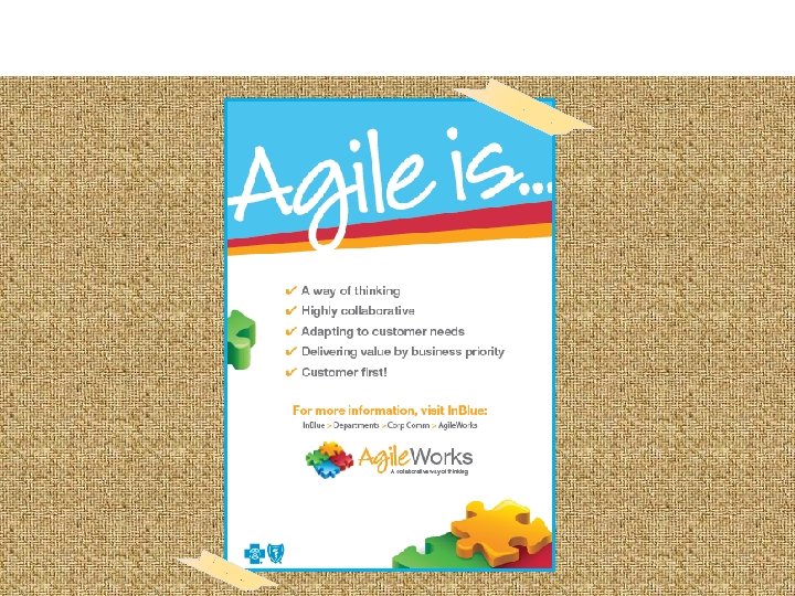 Agile Key Terms • Work to be done is captured in a list is called? “Backlog” • A brief statement that describes a piece work that can be executed in a sprint is? “User Story” • Work broken into 2 to 4 week chunks is called? • How much work a team can get done is called the team’s? • Key Scrum meetings are called? • A project’s scope and progress is visually represented by? “Artifacts” • We call the rooms where Agile teams work together? “Collaboration Rooms” • Anything that prevents the team from making progress? “Impediments” “Sprints or Iterations” “Velocity” “Ceremonies”