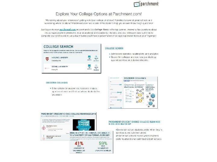 New This Year! Parchment Transcript Ordering Service • First 5 transcripts are FREE, $5 each additional. • Parents & students can see exactly when transcripts is received by institution. • Students can research colleges, compare colleges to each other, matches colleges to your student credentials. • Students and parents can view unofficial transcript at any time (also on Infinite Campus).