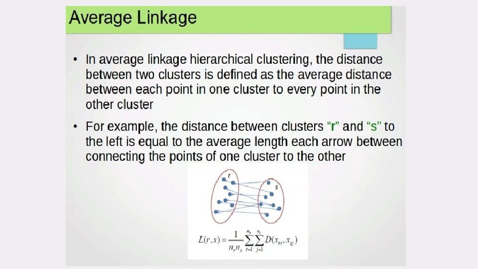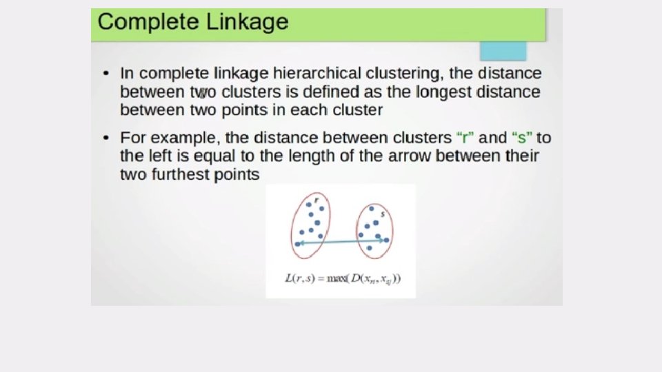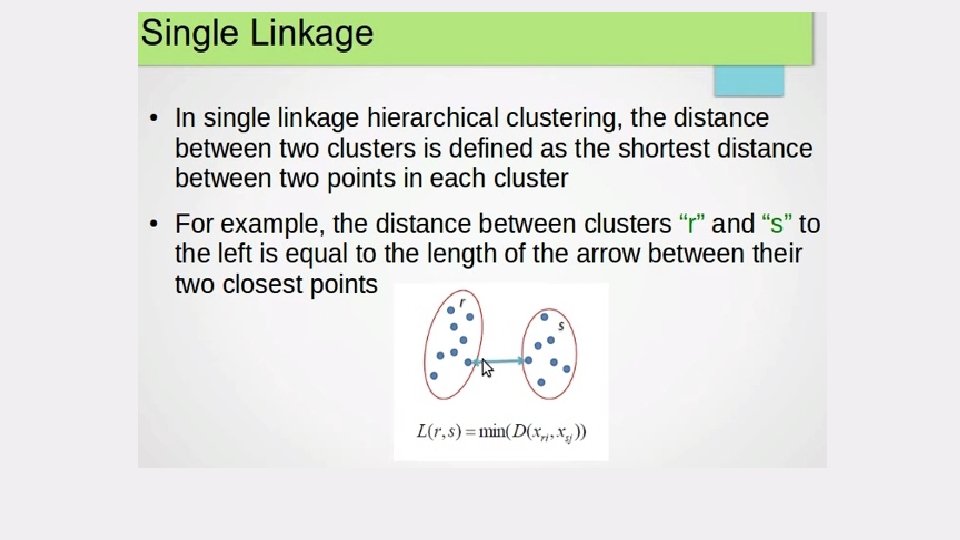 select the next cluster(s) to merge/split • The crucial step is how to best select the next cluster(s) to split or merge. • Compute distances (similarities) between the new cluster and each of the old clusters. • It can be done in different ways, • single-link • complete-link • average-link Agglomerative Clustering Divisive clustering
