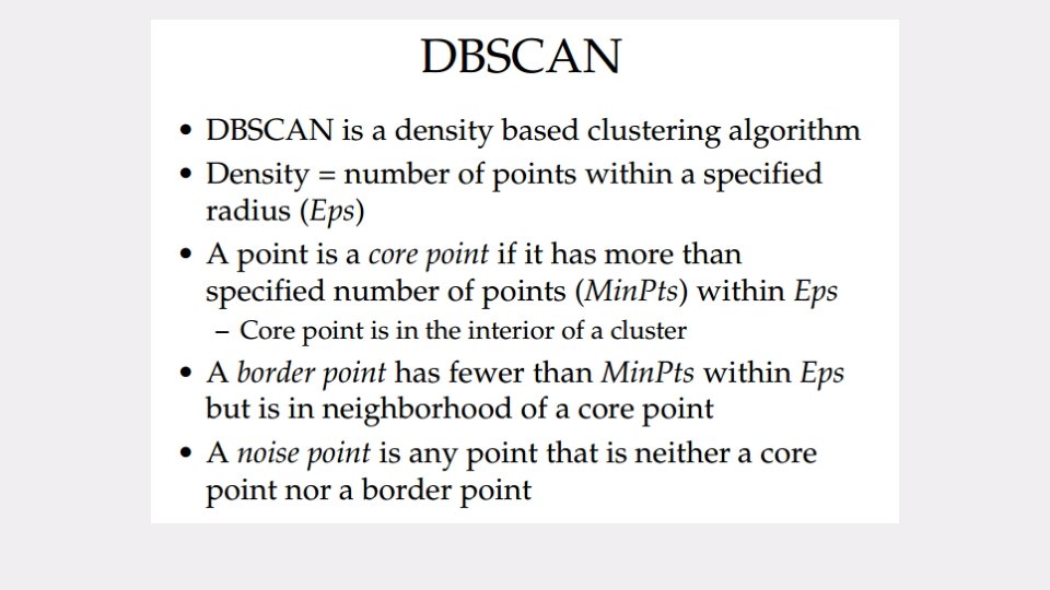 Core, Border & Outlier Border A point is a core point if it has more than a specified number of points (Min. Pts) within Eps These are points that are at the interior of a cluster. Core = 1 unit, Given and Min. Pts, categorize the objects into three exclusive groups. Min. Pts = 5 A border point has fewer than Min. Pts within Eps, but is in the neighborhood of a core point. A noise point is any point that is not a core point nor a border point.