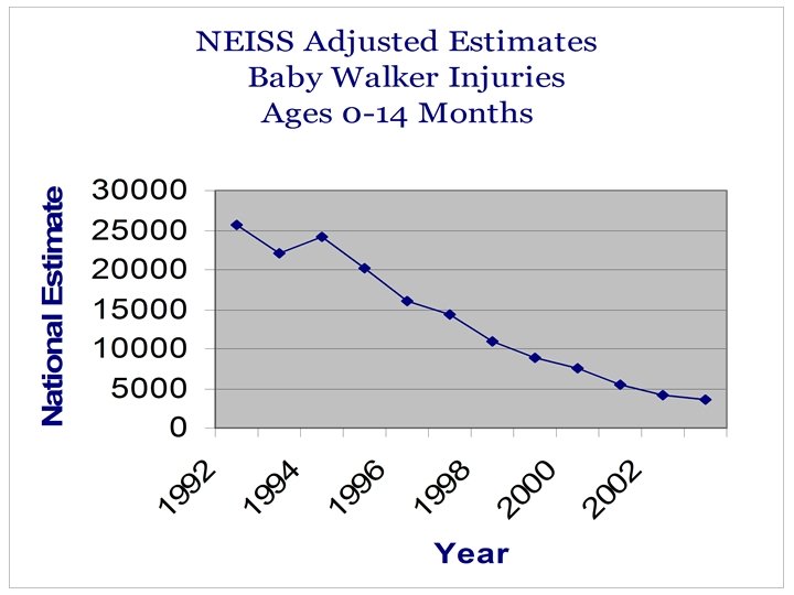 Baby Walkers • Baby walker injuries to children under 15 months have dropped 83% between 1995 and 2003. • Falling down stairs accounts for majority of baby walker-related injuries. • Newly redesigned, safer baby walkers have special features that stop the walker at the top step.