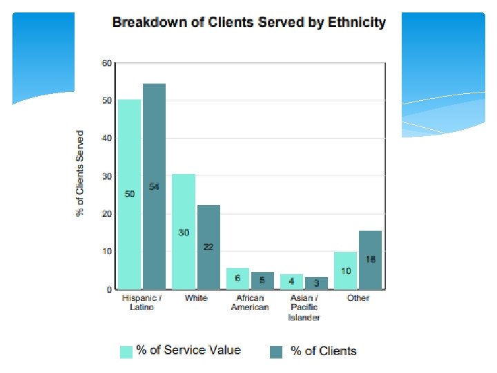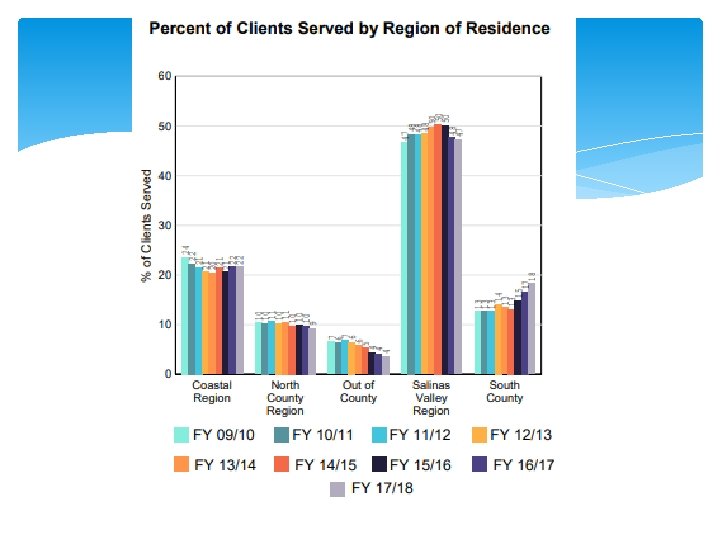 Monterey County Behavioral Health Data Driven Decisions (D 3) FY 13/14 Clients Served Total Service Value Avg Spent/Client Avg Age New Clients Discharge Gender (% Male) Language (% English) FY 15/16 FY 16/17 FY 17/18 7778 8529 10482 $56. 2 M $63 M* $83 M $7. 2 K $7. 4 K $8. 0 K 28 28 28 3164 4112 4780 3958 5063 5946 53% 52% 51% 11960 $82 M $6. 9 K 28 4701 6386 50% 12688 $89 M $7. 0 K 29 4664 6664 50% 80% 78% FY 14/15 80% *FY 14/15 Disallowance Rate = 59. 4%