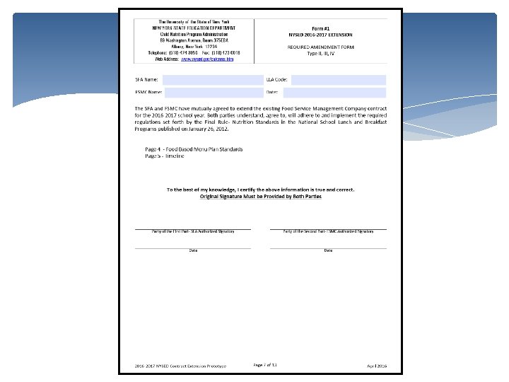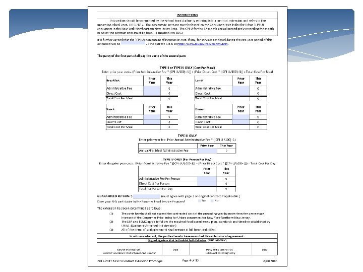 Extension Submission Prototype Extension Form includes: Checklist Section 1 and 2 completed – pdf automatically calculates the increase based on CPI-U Form 1 completed (HHFKA Amendment) Debarment option A or B completed Certificate of Lobbying