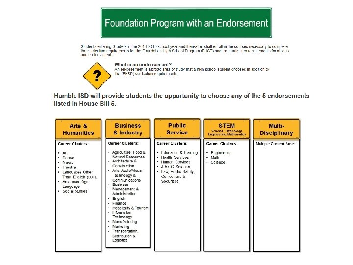Endorsements The purpose of the FHSP graduation plans is to…. • Instill flexibility in public education by enabling students to either pursue a traditional path into colleges and universities or move directly into the workforce (ex. Welding, Cosmetology certifications) • An endorsement is similar to a college major • Students can earn an endorsement in one of the following areas: 1. STEM (Science, Technology, Engineering, and Math) 2. Business and Industry 3. Public Services 4. Arts and Humanities 5. Multidisciplinary Studies
