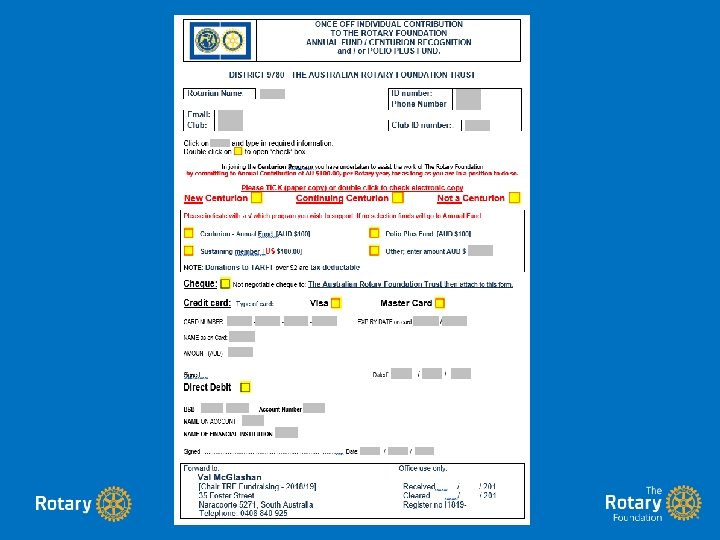Things I am asked about? Are D 9780 Rotarians sent a reminder for Centurion, Sustaining, or PHS contributions? Yes, every Rotarian will receive a contribution reminder via their club Foundation person or secretary. PHS reminders come from Parramatta. Can Rotarians use EFT for contributions to Foundation? Parramatta prefer contributions via Cheque, Credit Card or Direct Debit. Why send contributions via district fundraising chair? • Centurion program is managed by District, not Parramatta. • To verify contribution has documentation work and information. How do I get my RF contribution receipt after I contribute? Receipts are posted or emailed using your contact details in the RI data base. Where do I send contributions or get forms for contributions? Mailing details are on all the various contribution forms that are down loadable from the D 9780 Website.