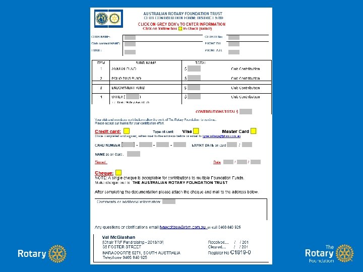 Key Points to take away: Clubs please set Annual and Polio contribution goal for club year. It helps with district budgeting and is non binding. PHF IS NOT AN AWARD, only the recognition of a contribution to our Foundation. Ensure all members details are correct in district web site data base, details will ripple through to RI. Be wary of using social media and / or third party collectors if require AU tax receipt or PHF recognition points. Cannot be fixed later… Please consider sending Centurion contributions in Foundation Month (November) and other contributions to district chair PP Val Mc. Glashan by mid June to ensure they are accrued in the current club year.