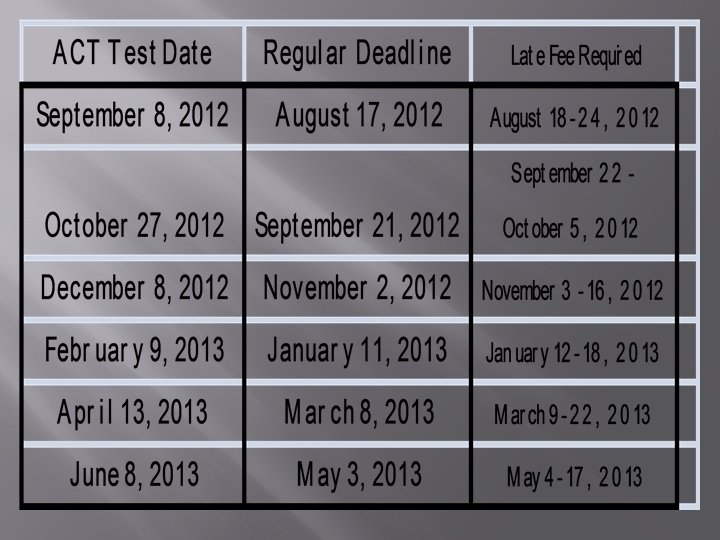 Senior Year Time Line � � � September Finalize Resume & ask 3 People for a letter of recommendation. (make copies to keep on file) Apply to colleges and complete scholarship applications Register for the ACT October � Search for scholarships online � Fill out scholarships from Counselor � Schedule College Visits � Order Senior Graduation Supplies � Continue to keep grades up � Take ACT –Test Date October 27, 2012