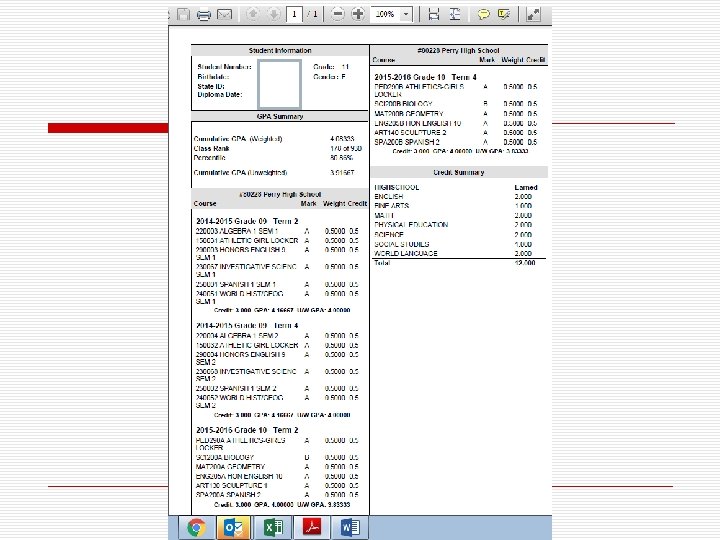 What should be on the transcript? o Demographic information o 9 th – 11 th – correct school, classes, grades, and credit o 11 th grade summer school grades and credit o Transfer student o Term GPA vs. Cumulative GPA – Weighted/Unweighted Core o Term credits vs. Cumulative credit (should be @ least 18) o Letter grade vs. Pass/Fail o Failed, Incomplete, Repeated courses o 11 th- 12 th – EVIT credit o 12 th – CO-OP credit o GPA: Standard and Weighted o Class Rank o Requesting Official Transcript- Parchment