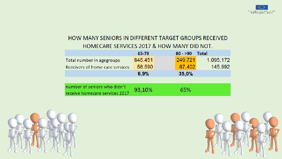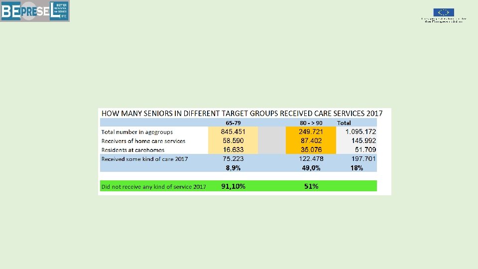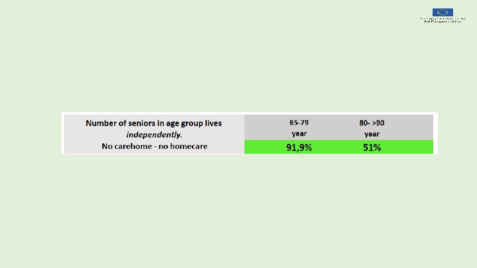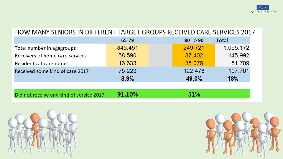Let` us establish an overall common and shared understanding of how senior live looks How many stay independent How many might become dependent later in life. Need of homecare service Need of institutional care
