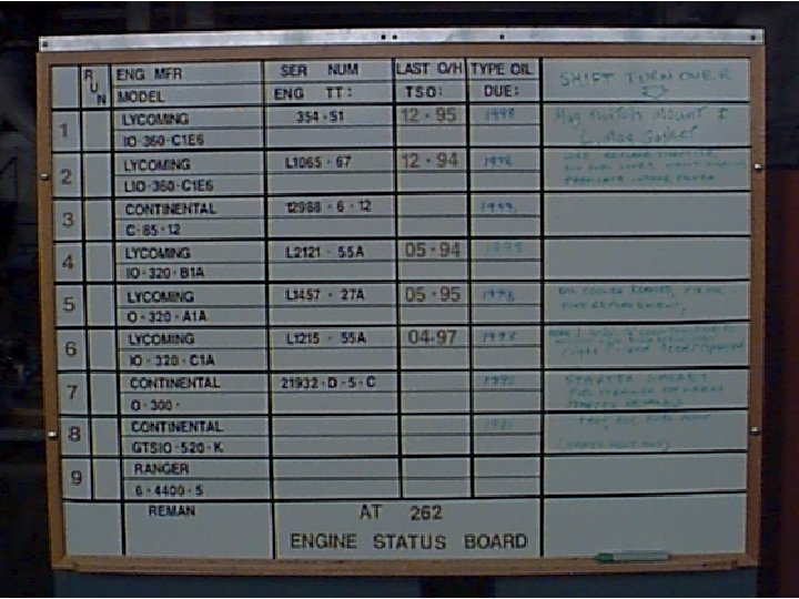 Factors Affecting Engine Performance • Detonation The explosion of the fuel/air mixture instead of a steady burning at approximately 35 ft/sec • This explosion causes an abrupt rise in cylinder temperatures and pressures that may cause engine damage (knock) • Detonation may be caused by several factors: low octane fuel high cylinder temperatures high prop load (cylinder pressure) lean mixture high compression ratios etc………. .