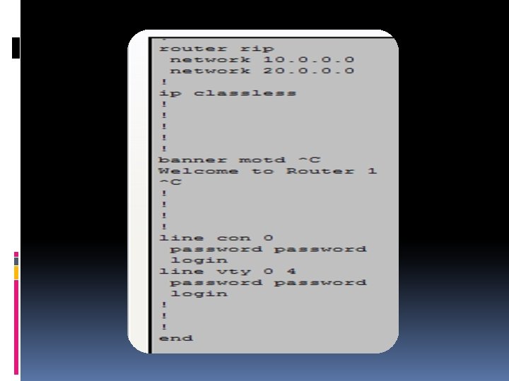 1. 1 Global configuration • Cisco allows us to configure the router to support various protocols and interfaces. • The router stores the configuration in the configuration file.