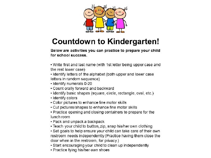 As a parent, you play the most important role in preparing your child for a successful beginning in Kindergarten.