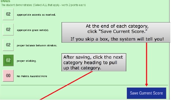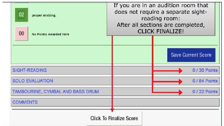Expectations while judging: ● ALL STUDENTS WHO ARE COMING TO AUDITION WILL BE HEARD. ● Ask any questions immediately of head judges ● Always click “Save Current Score” ● Use scratch sheets AND ctfest. net while adjudicating (one judge on each) ● Please use the script provided. It is INAPPROPRIATE to give verbal feedback or a lesson/masterclass. ● Stay on schedule! If students are available early (and are willing), please take them. ● Confirm the student’s name and record the student’s name on the scratch sheet. ● Be consistent and use the descriptors when adjudicating.