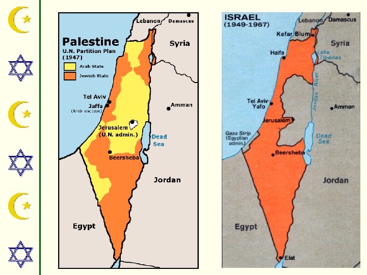 ENTER THE U. N. • UNABLE TO STOP THE VIOLENCE, BRITAIN TURNED THE PROBLEM OVER TO THE U. N. • IN 1947 THE U. N. PARTITIONED PALESTINE INTO SEPARATE JEWISH & ARAB STATES.