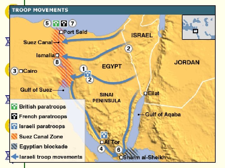 SUEZ CRISIS • Egypt seized control of the Suez Canal from Britain and France. • Egypt also blocked Israel’s use of the Straits of Tiran (their only way to the Red Sea) • Israel, Britain and France made a plan together to attack Egypt