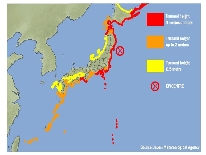 MARCH 2011 EARTHQUAKE • MARCH 11, 2011: – MOST POWERFUL EARTHQUAKE EVER TO HIT JAPAN – LED TO A TSUNAMI THAT SWEPT OVER THE NORTHERN PART OF THE COUNTRY • JAPAN ALSO FACES THE WORLD’S WORST NUCLEAR EMERGENCY SINCE CHERNOBYL: – THREE REACTORS SUFFERED PARTIAL MELTDOWNS – FUEL RODS AT ANOTHER REACTOR OVERHEATED AND RELEASED RADIOACTIVE MATERIAL INTO THE ATMOSPHERE • STATISTICS AS OF APRIL 7, 2011: – – DEATH TOLL = 12, 600 14, 700 PEOPLE LISTED AS MISSING MORE THAN 160, 000 PEOPLE IN TEMPORARY SHELTERS TENS OF THOUSANDS EVACUATED THEIR HOMES DUE TO THE NUCLEAR CRISIS