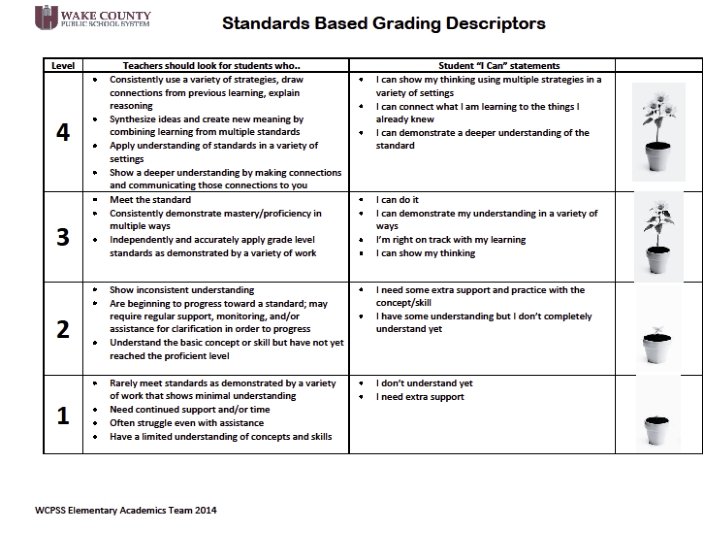 Common Core & Standards Based Grading • Students will receive 4 report cards and 4 interim reports this year. Standards Based Grading is used to determine each student’s grade. • Along with report cards, IEP progress notes will be sent home at this time. • Additional information about the Common Core Standards can be found on the Wake County Public School System website.